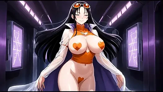 Хентай шлюшка Nico Robin подиуме - прозрачные наряды, мокрые сиськи и ласки текущей киски